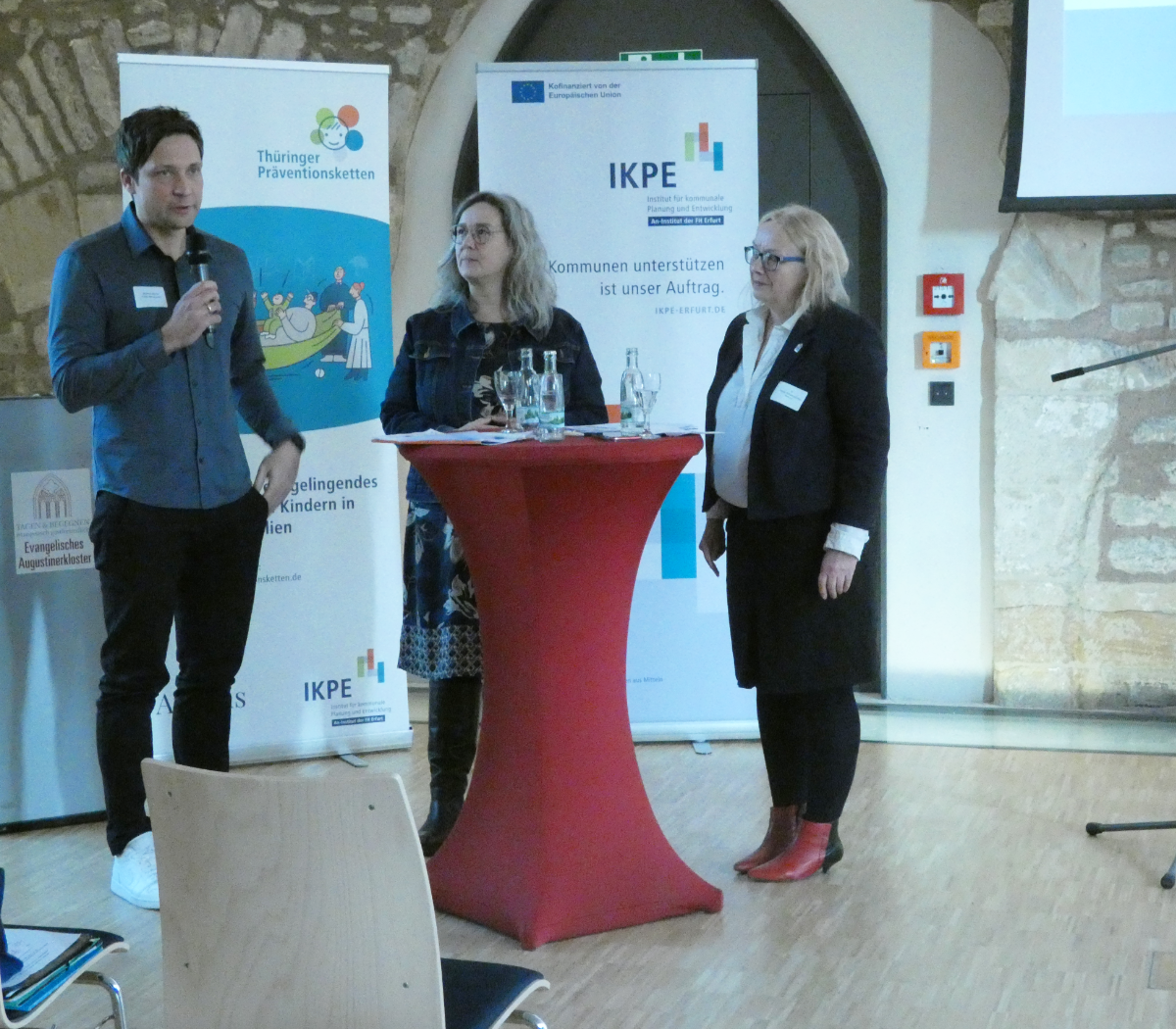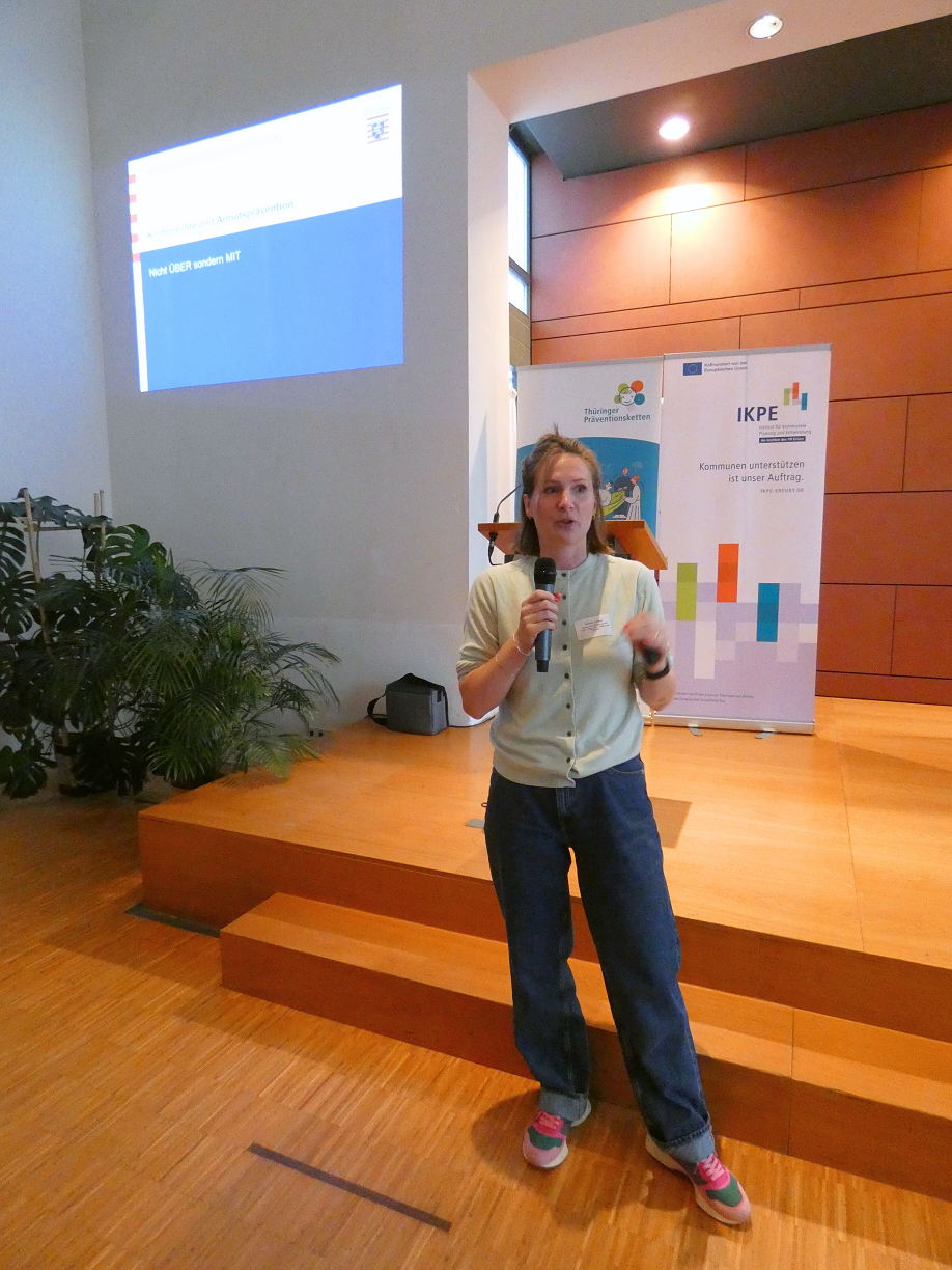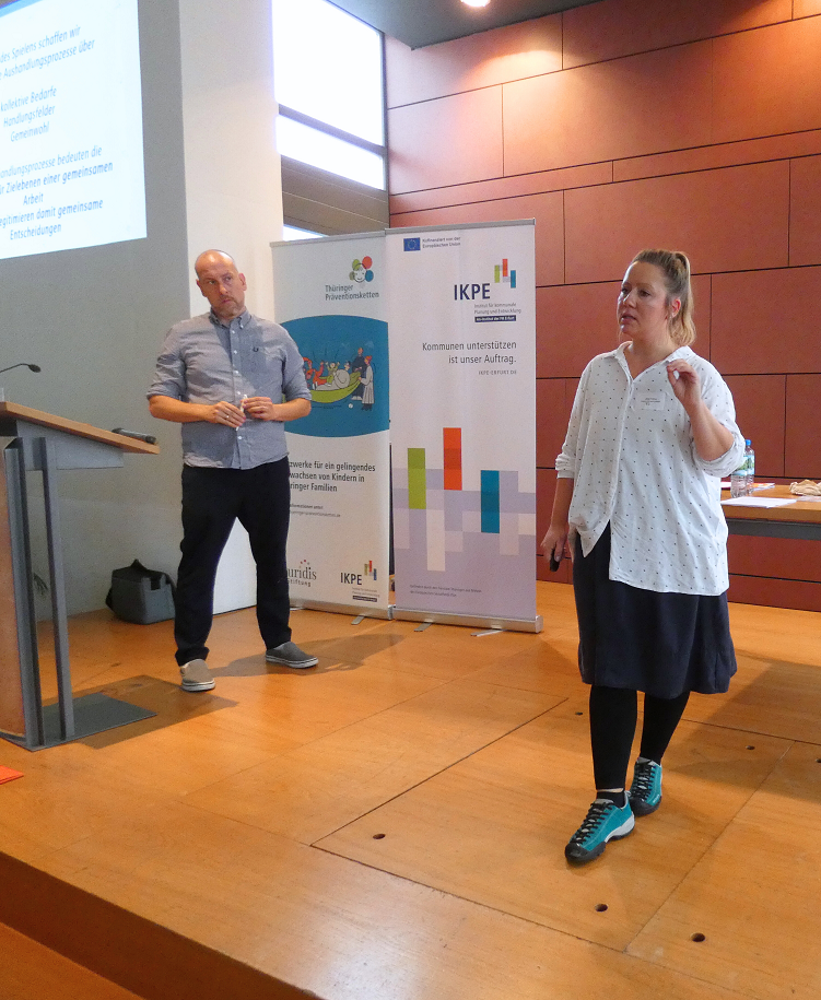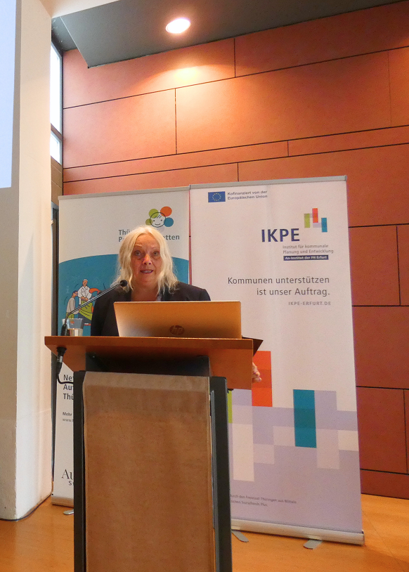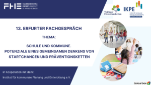 Mittendrin war das IKPE, ebenso drei Kommunen des Programms Thüringer Präventionsketten. Dr. Heike Schaarschmidt leitete zusammen mit der Jugendhilfeplanerin der Stadt Halle (Saale), Stefanie Goy, den Workshop 3. Hier wurde der enge Zusammenhang von Präventionsketten und Jugendhilfeplanung diskutiert (inkl. des Bedarfs an bundesweit geltenden Qualitätsstandards für die Jugendhilfeplanung), ebenso wie der Mehrwert von Gesamtkonzepten und ressortübergreifenden Strategien und Vorgehen. Aus Gera stellte Oberbürgermeister Julian Vonarb die aktuelle Situation der Stadt vor.