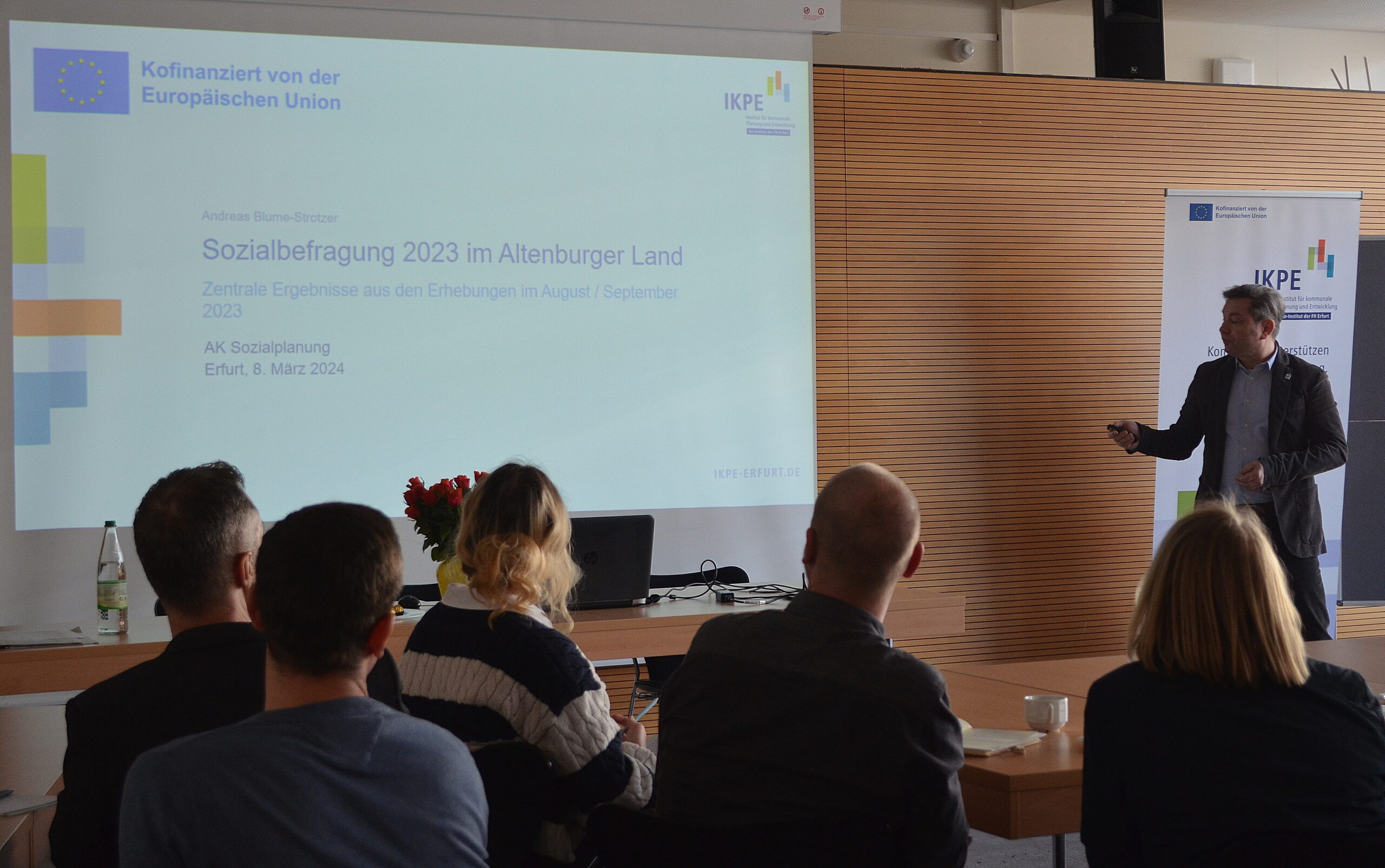 Altenburg/06.02.204. Ausgewählte Ergebnisse aus der “Sozialbefragung 2023 im Altenburger Land” stellte Andreas Blume-Strotzer, wissenschaftlicher Mitarbeiter des IKPE, Anfang Februar 2024 im Sozialausschuss des Kreistages des Altenburger Lands vor.