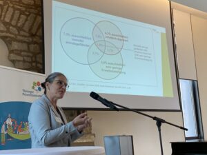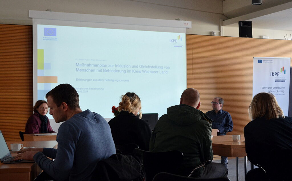 Dr. Herzer erläuterte die Ergebnisse aus der Sozialbefragung im Altenburger Land 2023, mit der das IKPE vom Landkreis Altenbruger Land beauftrag worden war.Ein weiteres Thema war der Aktionsplan zur Inkluson und Gleichstellung von Menschen mit Behinderung im Landkreis Weimarer Land”. Sozialplanerin Antje Schmerbauch (Weimarer Land) und Dr. Stefan Huber (IKPE) berichteten über die Erfahrungen aus dem Beteiligungsprozess.