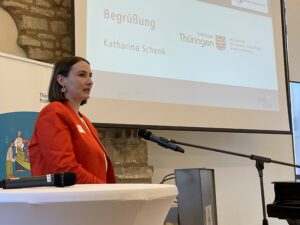 Nach den Grußworten von Dirk Otto, Referatsleiter Arbeitsmarkt- und Berufsbildungspolitik, Fachkräftesicherung, Arbeits- und Tarifrecht im Thüringer Ministerium für Arbeit, Soziales, Gesundheit, Frauen und Familie (TMASGFF) und Anke Schröpfer, Referentin für Zentrale Prüfungen, Zwischengeschaltete Stelle ESF, Internationale Bildungsangelegenheiten, Berufsorientierung, Kooperation Schule – Jugendhilfegaben im Thüringer Ministerium für Bildung, Jugend und Sport (TMBJS), gab Prof. Dr. Judith Hollenweger von der Pädagogischen Hochschule Zürich online zugeschaltet thematische Impulse.