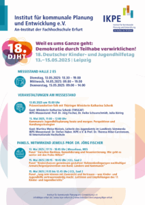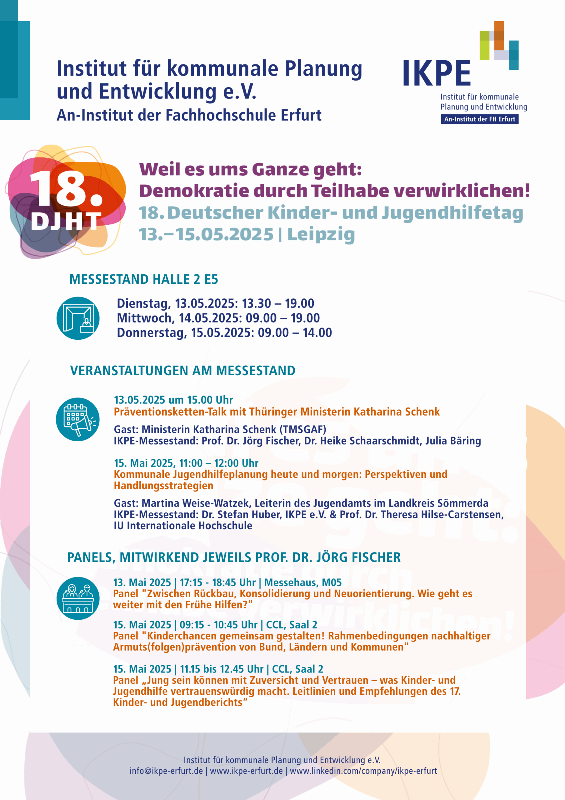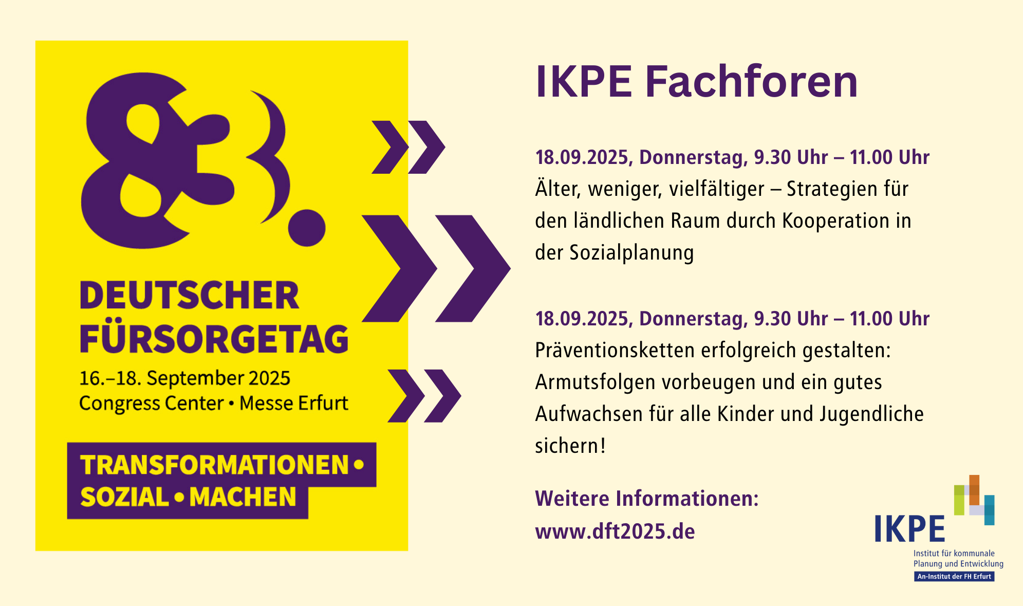 Auf dem 18. Deutschen Kinder- und Jugendhilfetag 2025 in Leipzig haben wir uns an der bundesweiten Debatte zu Demokratie und Teilhabe beteiligt. Beim 83. Deutschen Fürsorgetag in Erfurt war das IKPE mit zwei Foren vertreten und brachte dort Perspektiven zu den Herausforderungen ländlicher Räume sowie zur Weiterentwicklung von Präventionsketten ein.