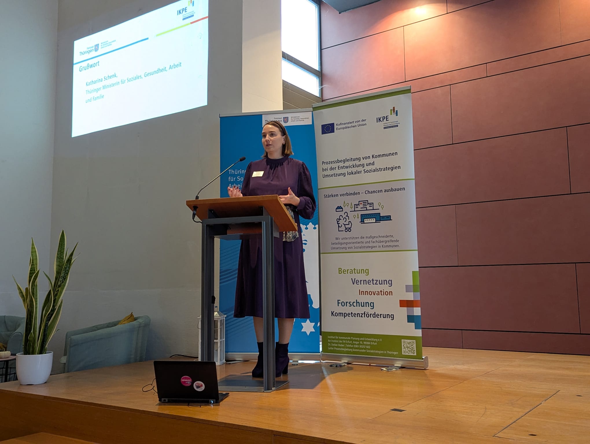 Im Arbeitskreis Sozialplanung am Thüringer Ministerium für Arbeit, Soziales, Gesundheit, Frauen und Familie (TMASGFF) stellte sich das Team des Projekts “Prozessbegleitung von Kommunen bei der Entwicklung und Umsetzung lokaler Sozialstrategien”. Die Prozessbegleiter*innen sind seit September 2023 am Institut für kommunale Planung und Entwicklung (IKPE) am Start und beraten Thüringer Kommunen bei der Umsetzung kommunaler Sozialstrategien.