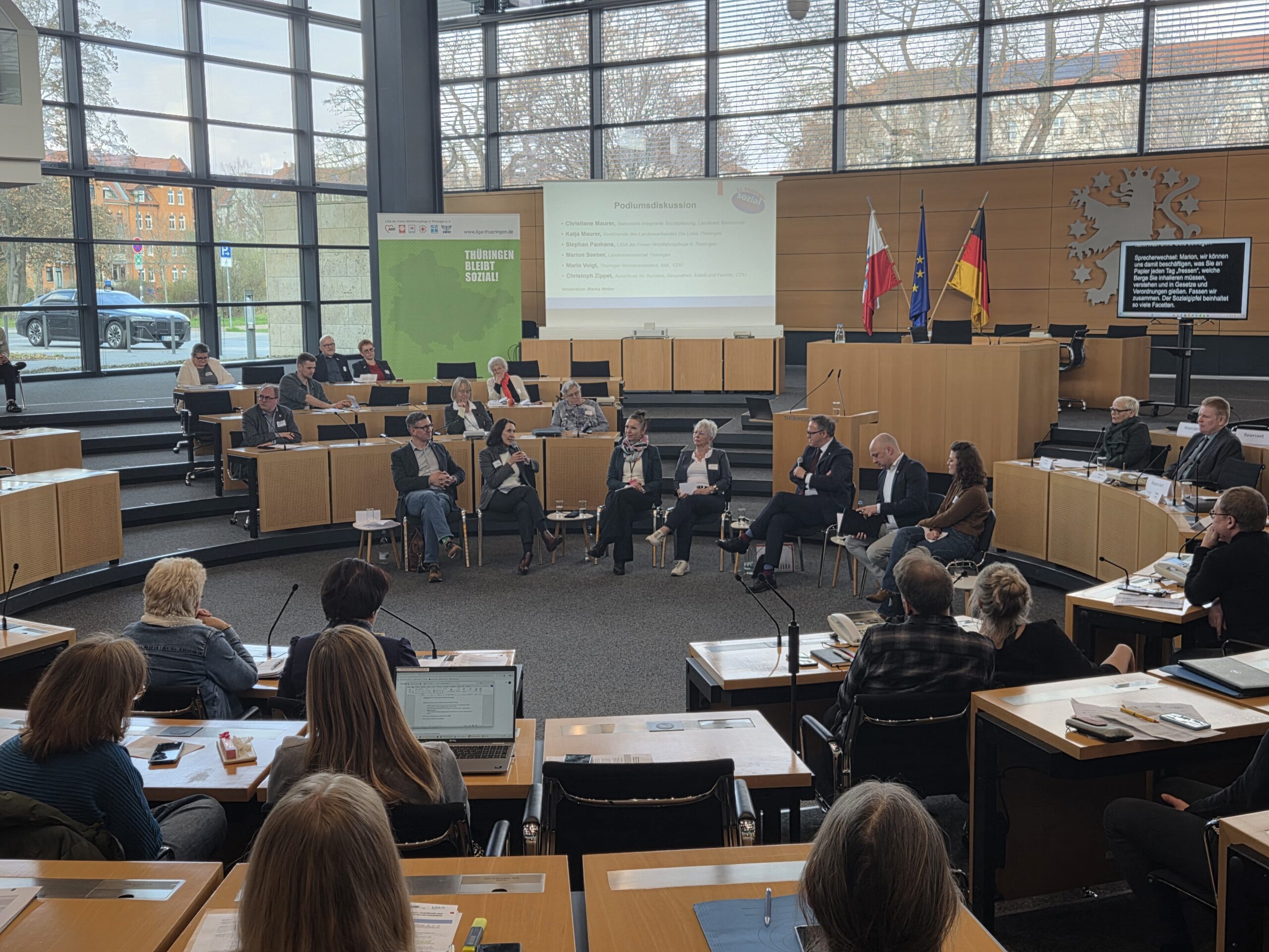 Die Ergebnisse flossen in die abschließende Podiumsdiskussion ein, an der Vertreterinnen und Vertreter aus Politik, Verwaltung und Verbänden teilnahmen. Der Sozialgipfel machte deutlich: Integrierte Sozialplanung ist in Thüringen bereits breit etabliert – nun gilt es, die bestehenden Ansätze weiter auszubauen und gemeinsam zukunftsfähig weiterzuentwickeln.